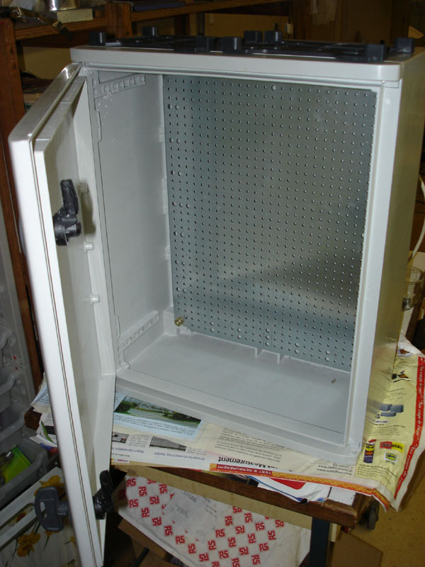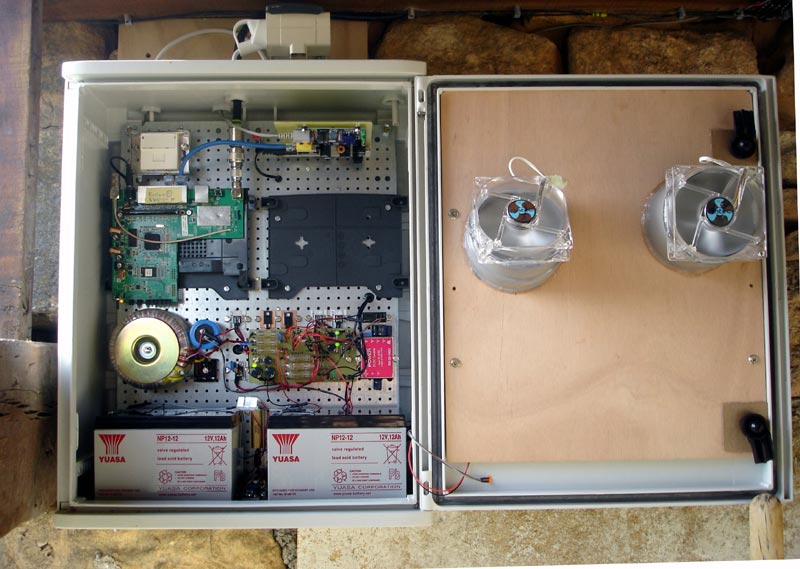 ![]() Armoire contenant un routeur Récepteur et un routeur Ré-émetteur - L'installation est alimentée en basse tension 24 V via un câble souterrain de 150 mètres. |