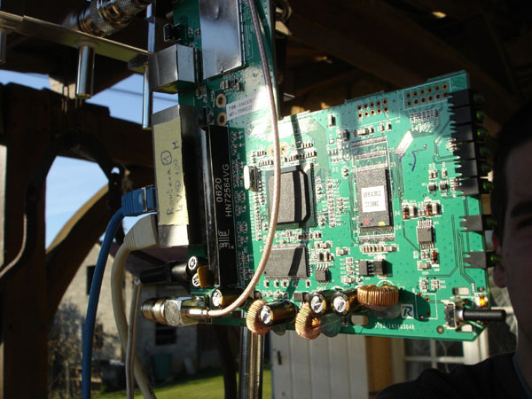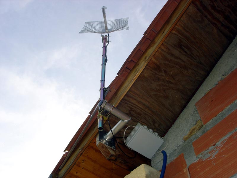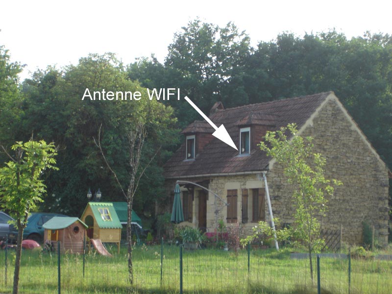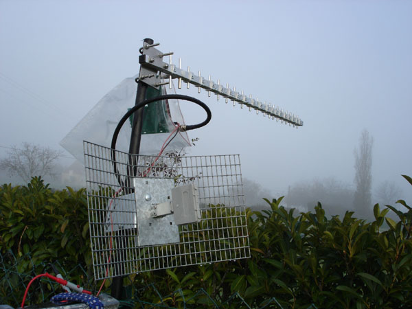 ![]() Ici une antenne parabolique est utilisée du fait de la présence d'un gros arbre sur le trajet. ( distance 900 mètres ) |