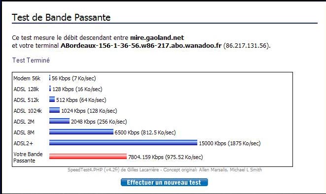 ![]() Un autre Test à 7,8 Mega ; on atteint la limite des caractéristiques ADSL. Le Modem est situé à 3,5 Km du DSLAM ( répartiteur télephonique ) A cette distance, le débit normal est de 6 Mega environ. |