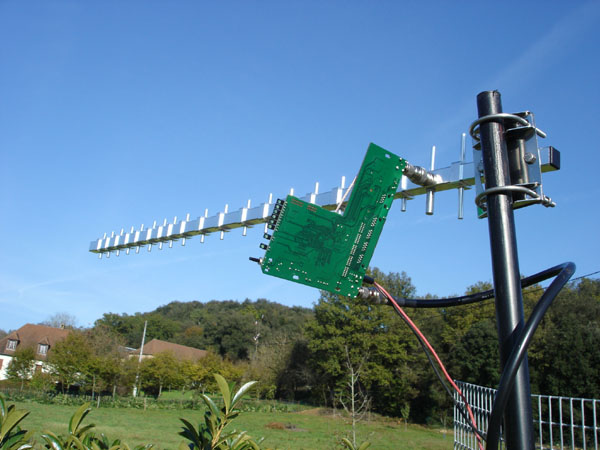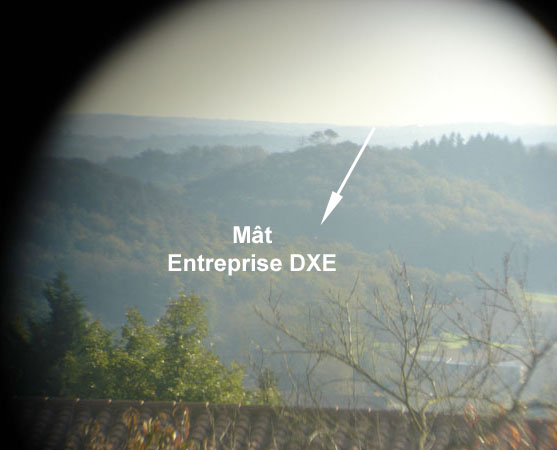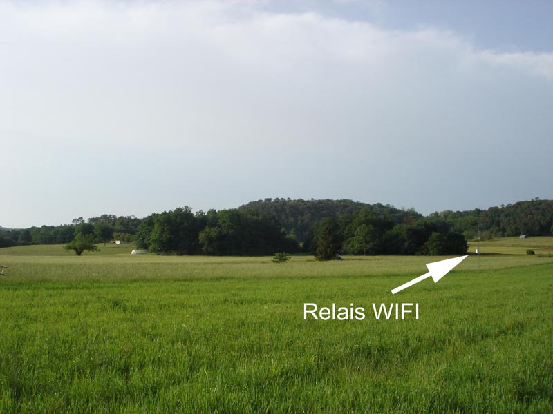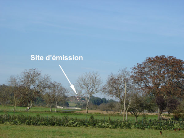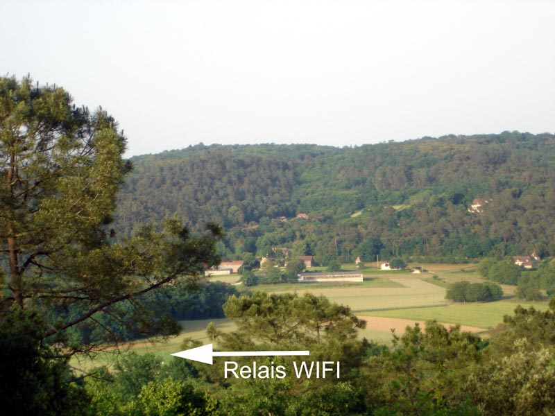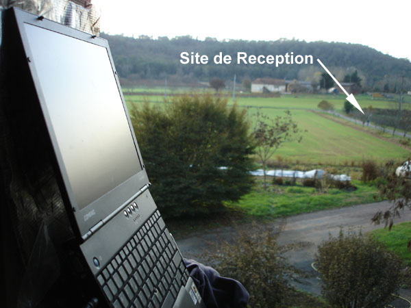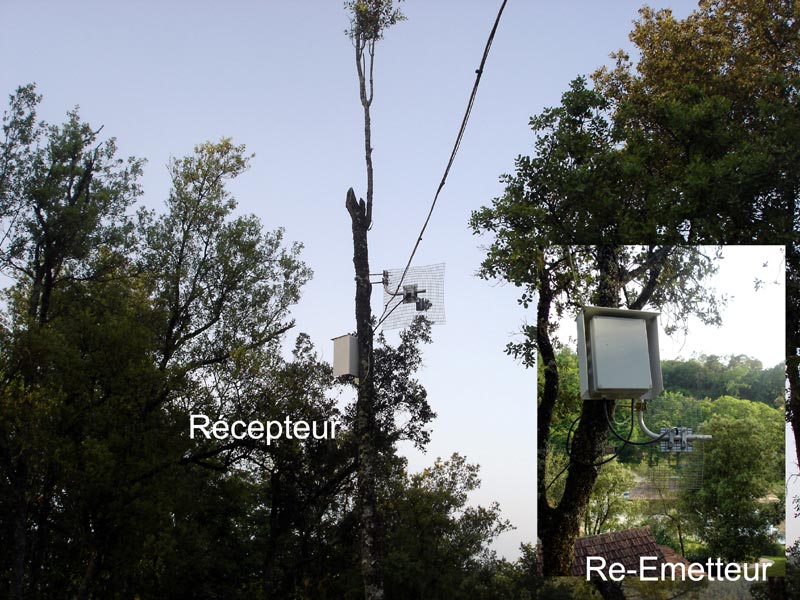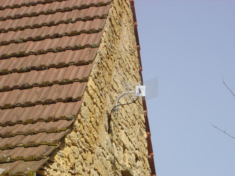 ![]() Ici une antenne parabolique est utilisée du fait de la présence d'un gros arbre sur le trajet. ( distance 900 mètres ) |
