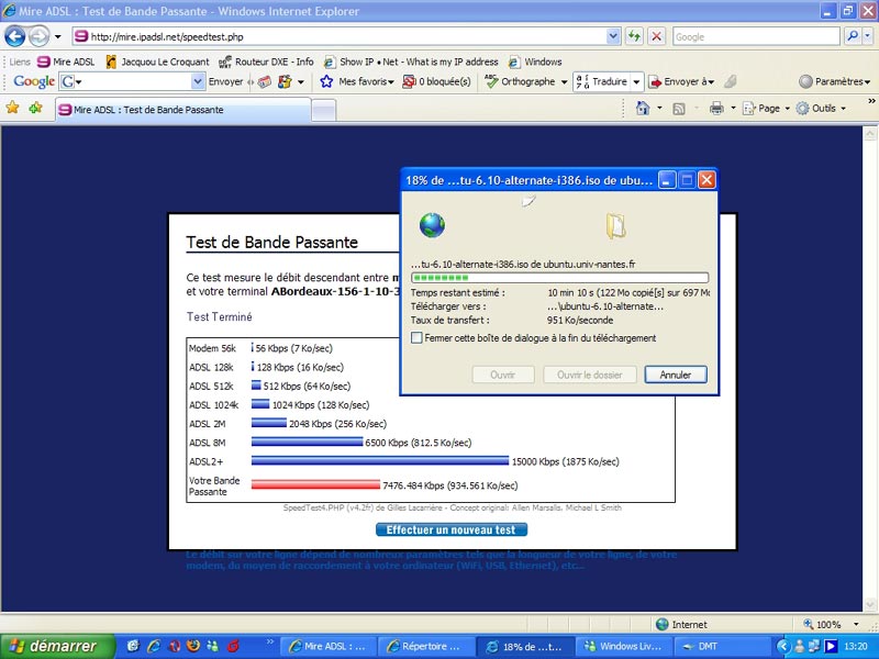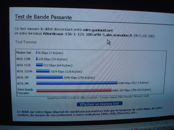 ![]() Les performances sont plus qu'honorables, le lien wifi n'amène aucune réduction de performances. Ici le modem ADSL a été poussé à 7.4 Mega débit réel - Un fichier de 700 Mo est télechargé en moins de 12 minutes. |
