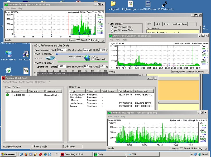 ![]() Depuis l'entreprise DXE, on peut avoir accès au monitoring des équipements réseau. Visualisation de la bande passante utilisée - caractéristiques de la liaison ADSL - utilisateurs connectés |